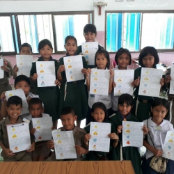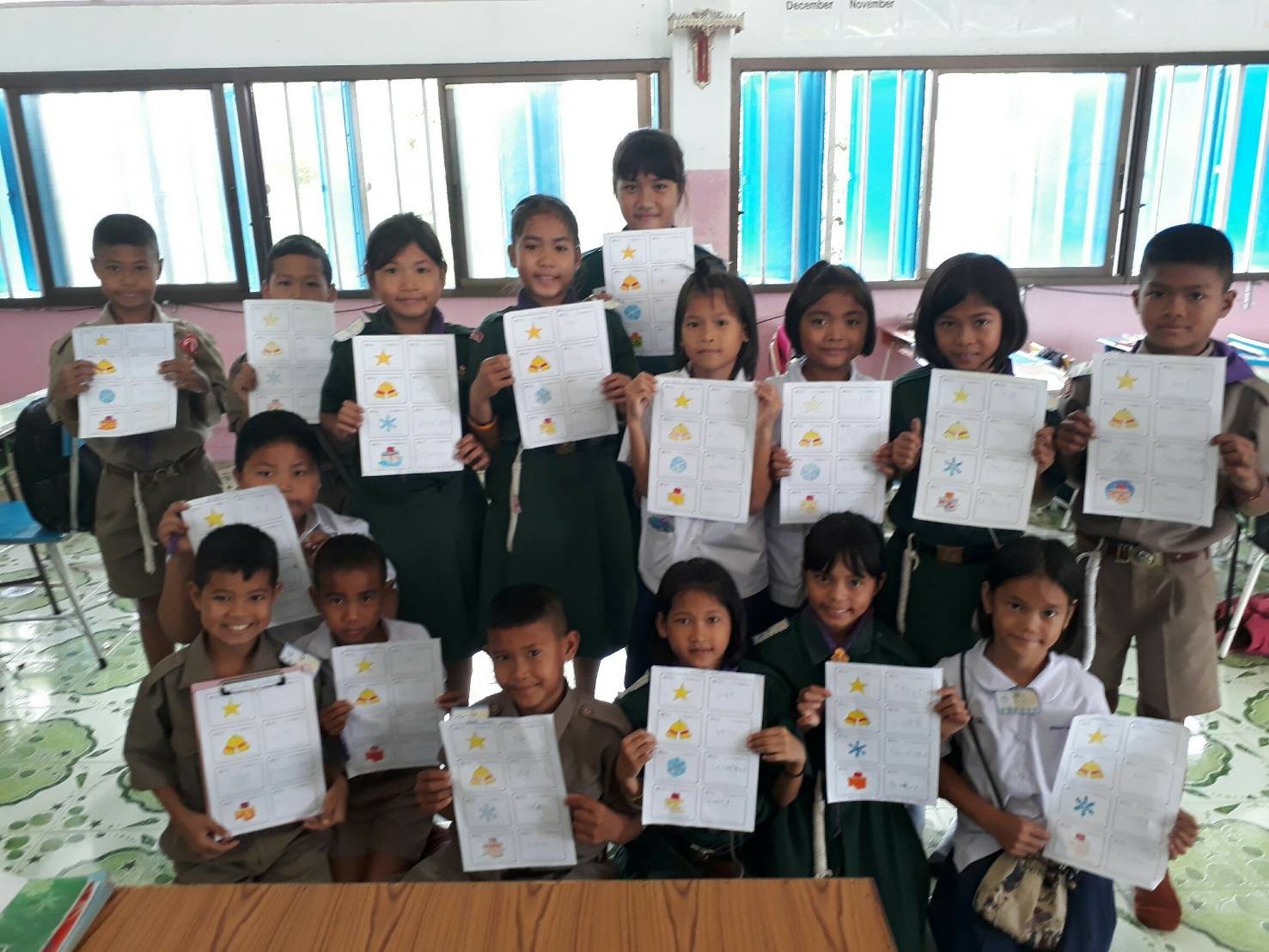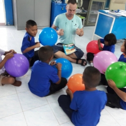 Dus maar het creatieve brein aan het werk gezet, ondanks dat ik geen enkel idee had van level van engels, verwachtingen enz.. Dus nog middenin de jetlag maar pogen tot "My name is .....", : I am .. years old" (de schattingen liepen tussen de 34 en 72 uiteen) en Little Little Duckie (een liedje dat ik tijdens mijn studie bij een uitwisseling in Zweden tijdens slemppartijen heb geleerd, maar ook prima te gebruiken bij Thaise kids vind ik :-) )