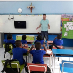 Dag 1 zou ik alleen kennismaken, mijn takecare-volunteer was ziek en is ook teacher, dus teacher Denis werd onaangekondigd voor de klas gepoot terwijl hij dacht alleen maar Sabadee Krap te hoeven zeggen :-)
