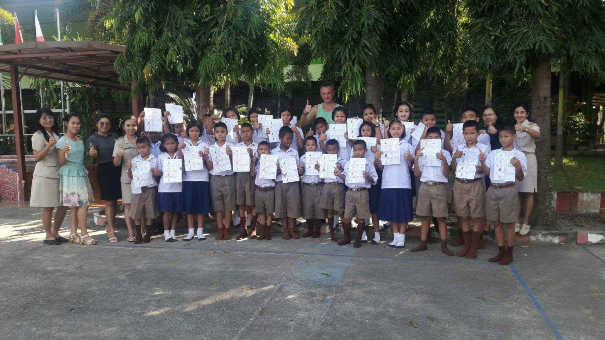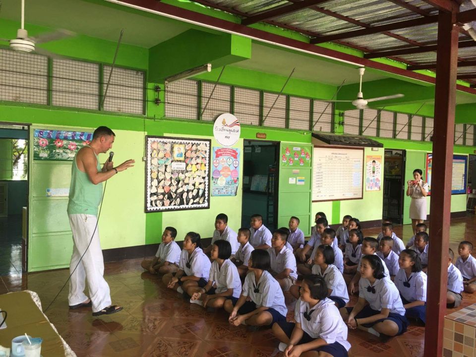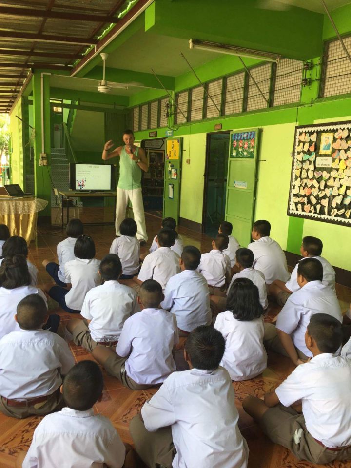 Met grote devotie en bijna angstige blik werd ik verwelkomd. Gelukkig veranderde dat wel in de les. Maar met mijn 1.95 blijf ik voor deze kids (de gemiddelde Thaise volwassen man meet 1.70) een indrukwekkende giant. Ik sluit vaak af met hig5/low5/boks, maar dat vonden ze in het begin op deze school nog doodeng, maar na een paar durfals ging dat ook al weer ;)
