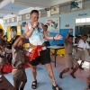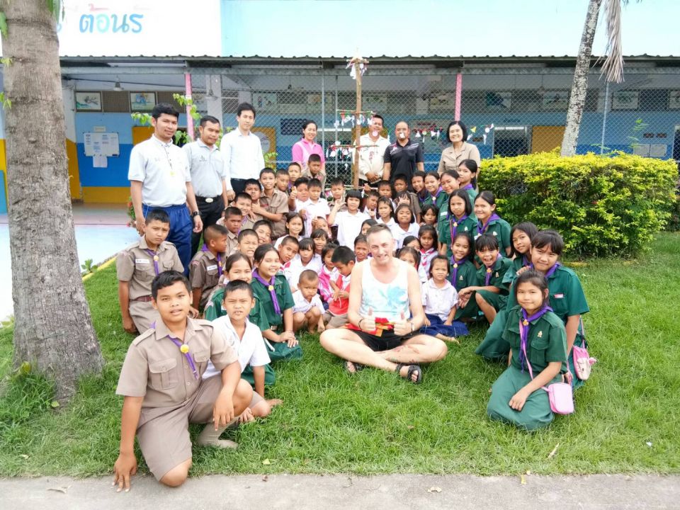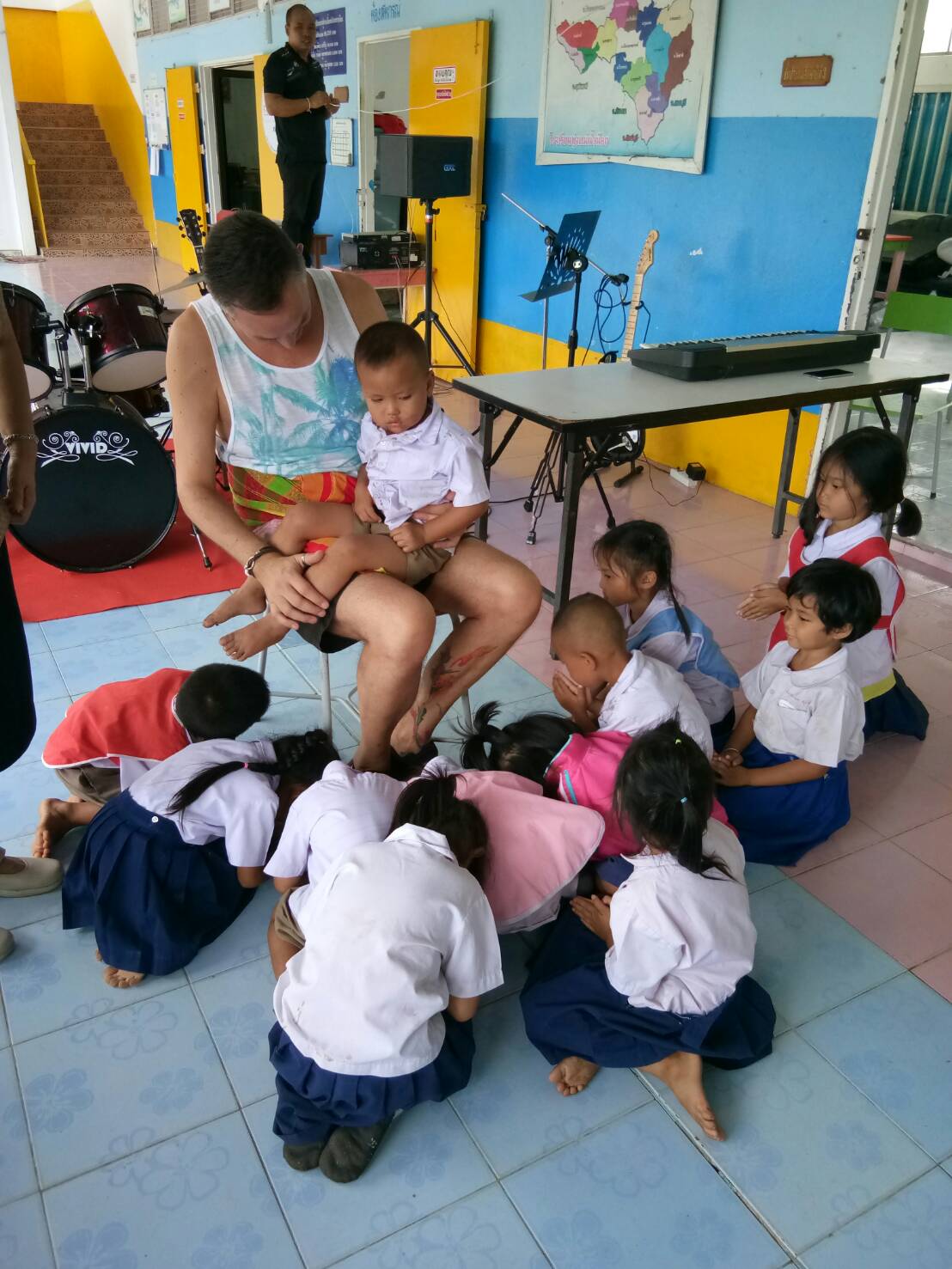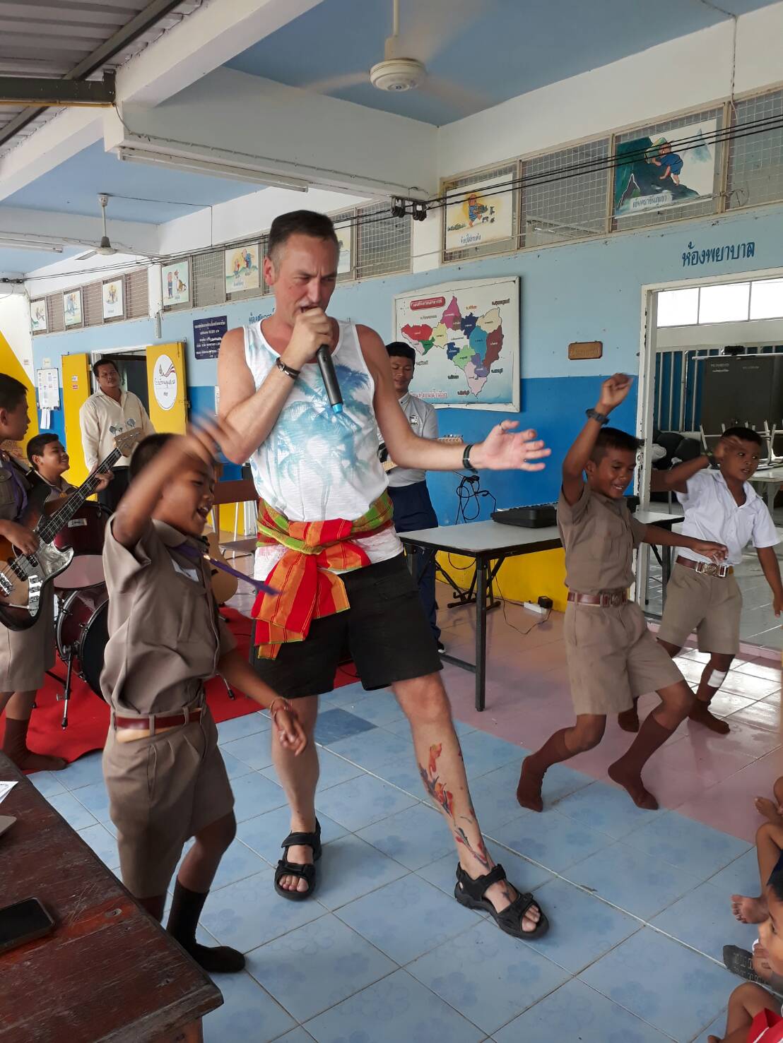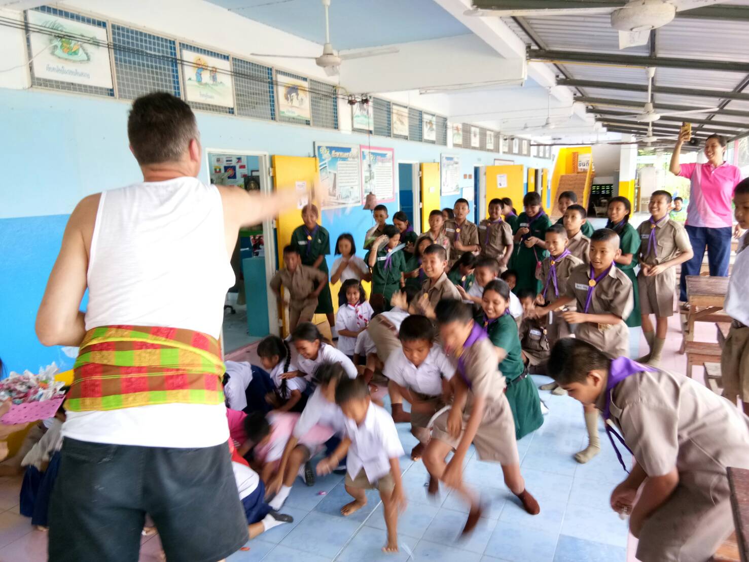 Het programma dat ik had bedacht en gecommuniceerd werd met 1 beweging weggevaagd door de directeur. Hij wilde dat ik 1 liedje met de kids deed. Maar goed, mijn noordelijke stijfkoppigheid liet dat natuurlijk niet toe. En inmiddels wat Thais wijzer geworden bracht ik met mijn beste glimlach mijn programma in rondom het zijne en hij inmiddels wijzer geworden polderde rustig mee.